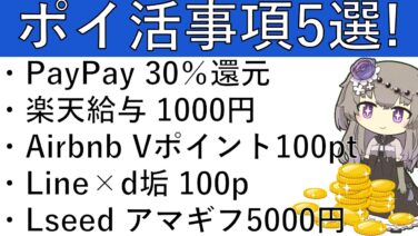 ポイ活攻略【ポイ活事項5選‼】PayPay 30%還元/楽天銀行 給与受取で1000円/Airbnb Vポイント利用手続きで100pt/Line×dアカウント 100pt/Lseed アマギフ5000円