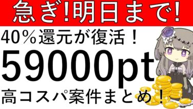ポイ活攻略【明日まで‼】高コスパ案件まとめ!40%還元クーポンが復活&アメフリの高コスパ案件で計5万9000pt!運がいいとポイントが2倍に⁉